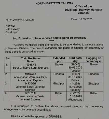 इसी क्रम में ट्रेन नम्बर 14235/36 जो बरेली से वाराणसी तक चलती है उसका विस्तार करते हुए गाजीपुर तक कर दिया गया है। इसका 11 अक्टुबर को शुभारंभ होगा।।इसी तरह ट्रेन नम्बर 12237/38 वालाजम्मूतवी को बलिया तक विस्तार मिला है। इसे 15 अक्टुबर से चलाने का निर्णय हुआ है।ट्रेन नम्बर 19167/68 वाराणसी सीटी से  अहमदाबाद चलने वाली गाड़ी को छपरा तक चलाने का निर्णय किया गया है। यह गाड़ी तीन अक्टुबर से चलेगी।सूरत से छपरा तक चलने वाली गाड़ी संख्या 19045/46 को थावें तक चलाने का निर्णय लिया गया है, जो 30 सितम्बर से चलने लगेगी।