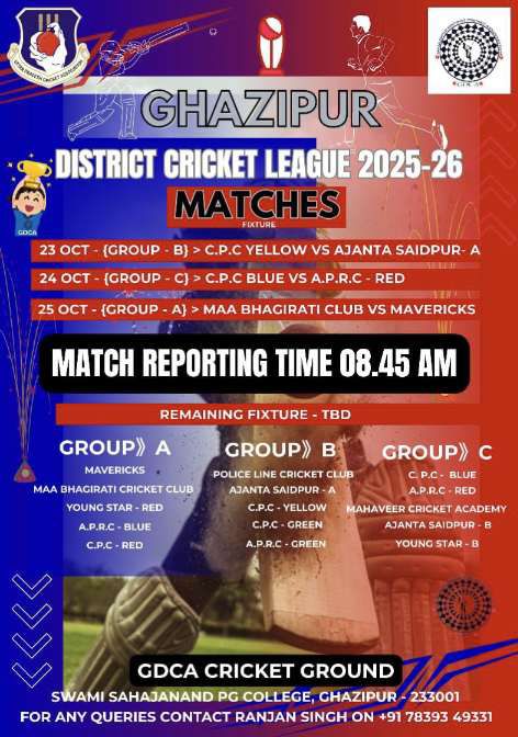 गाजीपुर डिस्ट्रिक्ट क्रिकेट एसोसिएशन के अध्यक्ष शाश्वत सिंह ने बताया कि गाजीपुर डिस्ट्रिक्ट क्रिकेट एसोसिएशन के तत्वाधान में सत्र 2025-26 में होनेवाले गाजीपुर डिस्ट्रिक्ट क्रिकेट लीग श्रृंखला के दूसरे सत्र का कल दिनांक 23 अक्टूबर 2025 से जनपद गाजीपुर के पीर नगर स्थित स्वामी सहजानंद स्नातकोत्तर महाविद्यालय के जी.डी.सी.ए. मैदान पर शुरू हो रहा है।