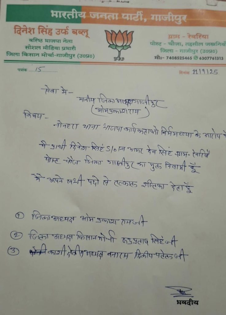 भाजपा खेमे में इस बात को लेकर बेचैनी है कि आगे क्या होगा? कई पदाधिकारी इस्तीफा दे रहे हैं तो क ई इस्तीफा देने का मन बना रहे हैं। दो दिन पूर्व सोशल मीडिया प्रभारी दिनेश सिंह उर्फ बब्लू ने अपने पद से त्यागपत्र दे दिया तो वहीं आज रविवार को मरदह मंडल के शक्ति संयोजक सुबाष पाण्डेय के साथ चार बुथ प्रभारियों ने इस्तीफा दे दिया है, जो सोशल मीडिया पर वायरल है। जिन बूथ अध्यक्षों ने इस्तीफा दिया है उनमें रविन्द्र राजभर, मनीष पाण्डेय, राजकुमार पाल व हरिनंदन राम शामिल हैं। अंदरखाने खबर है कि कई बड़े चेहरे बड़ा कदम उठाने के लिए उद्यत हैं। सोशल मीडिया में इस्तीफा के वायरल पत्र में युवा नेता निमेष पाण्डेय का कमेंट आने वाले दिनों में कोई नई कहानी की ओर इशारा कर रहा है। इन्होंने न्याय न मिलने की स्थिति में इस्तीफा देने की बात कह पार्टी के भीतर के लोगों की नींद में खलल डाल दिया है। खबर है कि कल सोमवार को ब्राम्हण रक्षा दल मुख्यमंत्री को संबोधित पत्र जिलाधिकारी के माध्यम से भेजा जाएगा, जिसमें पीड़ित परिवार को आर्थिक सहायता व जीविकोपार्जन हेतु नौकरी की मांग के साथ पुलिस पर मुकदमा दर्ज कराने की मांग शामिल होगी।